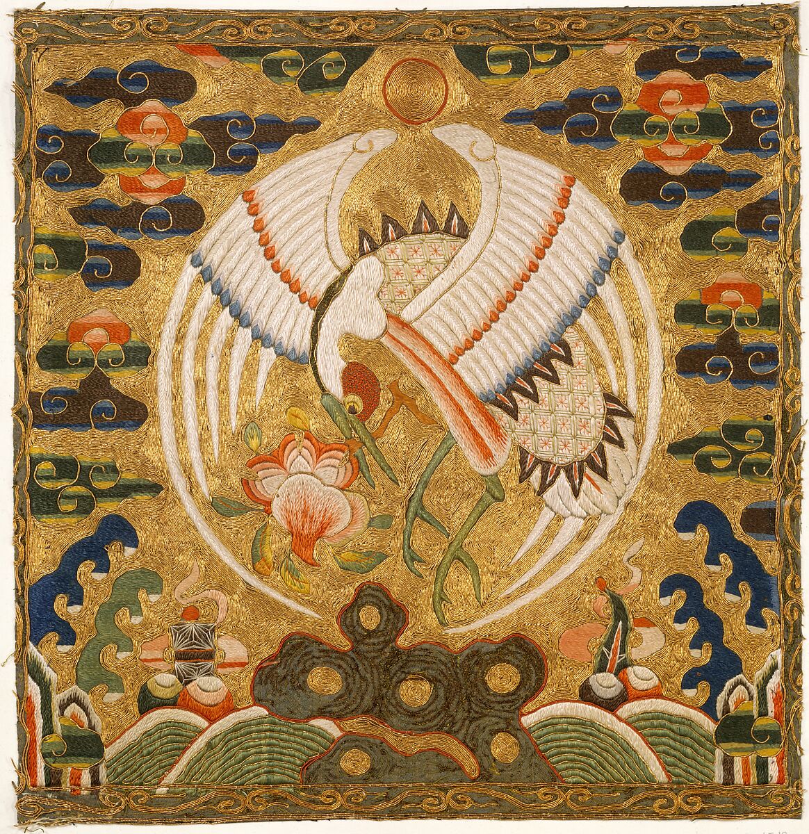 The Qing government generally adopted the earlier Ming system of rank badges, with the exception of some minor changes in the choice of animals. The crane on this badge corresponds to the highest civil rank.
