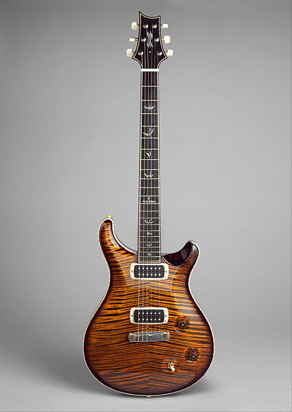Paul Reed Smith was one of the most important electric guitar makers of the last few decades of the twentieth century and introduced new designs at a time when many manufacturers continued to build based on mid-century models. He founded PRS guitars that is one of the largest electric guitar manufacturing companies of the twenty-first century. This electric guitar was a custom built instrument commissioned by Warren Esanu in 2013 for the Museum. Its design is directly to specifications of Paul Reed Smith and built by luthiers in the Stevensville, Maryland factory. It has a double-cutaway body with an outline that was designed by PRS. The top is of curly red maple and the back of African ribbon mahogany. It has purfling of red heart abalone with a natural maple wood binding. The neck is of curly maple and the fretboard is ebony and has twenty-two nickel-silver frets. The fretboard is bound in red heart abalone and there are mammoth ivory inlaid bird fretmarkers. There is a four point headstock with PRS Phase III locking tuning pegs and PRS stoptail brass inserts. The electronics include two PRS designed "408 humbucking pickups" and are controlled by volume and tone knobs and a 3-way toggle. The finish is described by PRS as a "light tiger eye micro burst."
