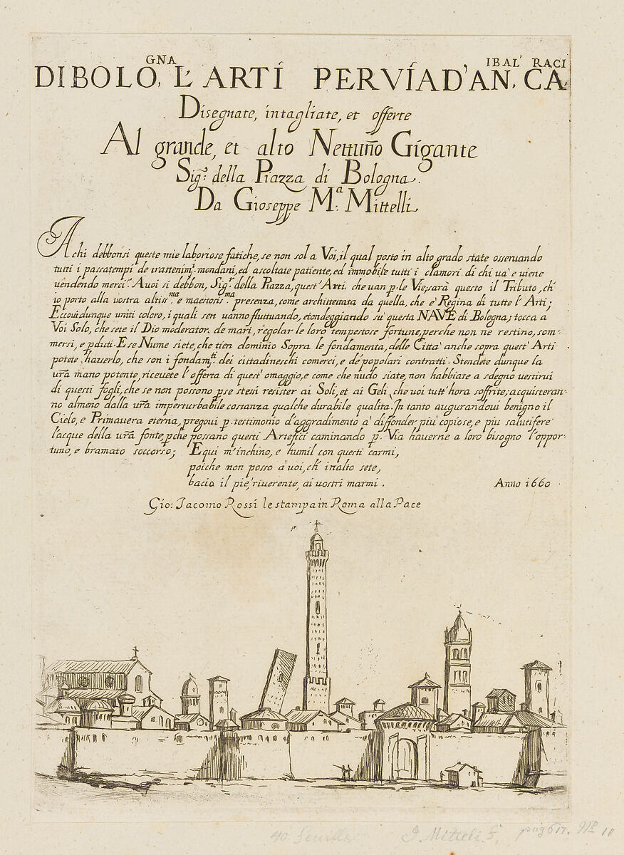 - Title: Frontispiece depicting a View of Bologna, from Di Bologna l'Arti per via D'An.ibal' Ca.rac, plate 1