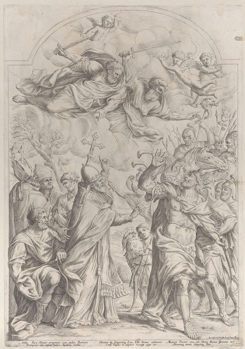 - Title: Pope Leo repulses Atilla from the gates of Rome and points to Saints Peter and Paul overhead