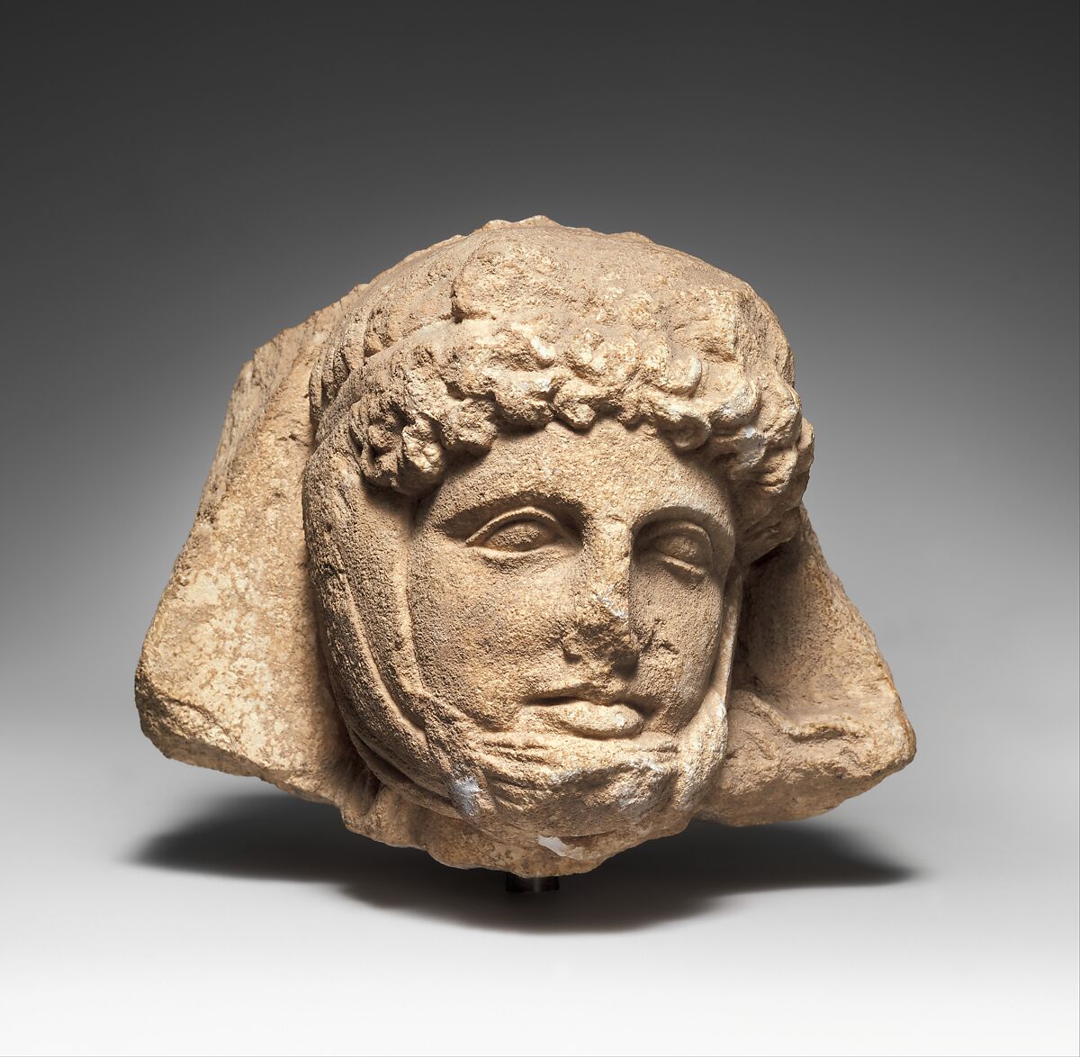 This finely carved relief head depicts a Persian, identified by the distinctive head scarf tied around the neck and pulled over his chin. The relief, once part of a pediment or metope adorning a Tarentine funerary naiskos, probably depicted a battle or hunt.