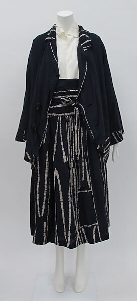 This ensemble, an iteration of designs presented in Kawakubo’s spring/summer 1985 collection “Mud-Dyed", exemplifies the designer’s work after 1979, when she abandoned her previous references and decided to “start from zero,” or to create clothes that had never been seen before in fashion. The collection, among her first presented to Western audiences in Paris, featured a consistent black and white palette, outsized silhouettes, asymmetry, and mud-dyed fabrics. The designs elicited extreme reactions from critics owing to their repudiation of the fashionable ideals of the period.