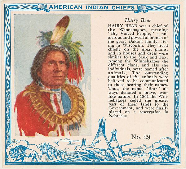 - Title: Card No. 29, Hairy Bear, from the Indian Chiefs series (T129) issued by Red Man Chewing Tobacco