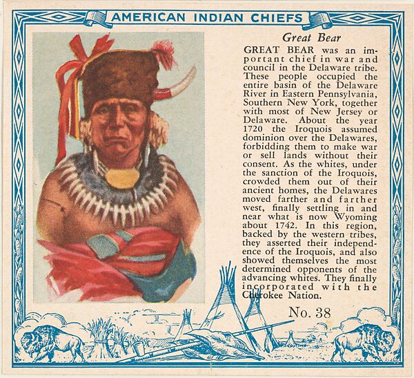 - Title: Card No. 38, Great Bear, from the Indian Chiefs series (T129) issued by Red Man Chewing Tobacco