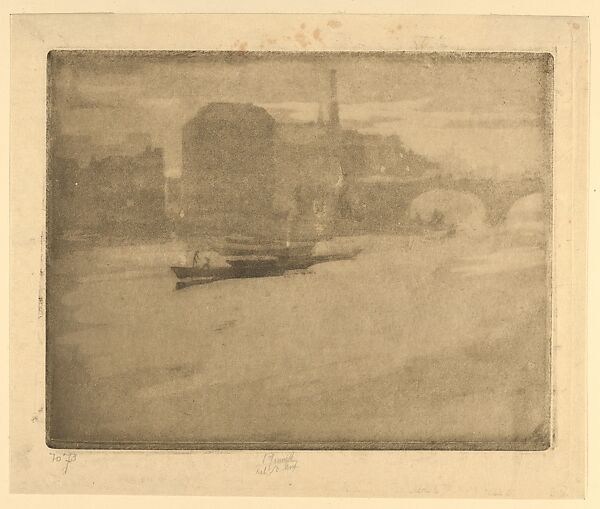 Pennell, a Philadelphia-born Quaker, spent the first two decades of his career abroad, living primarily in London, where he became a close associate of Whistler. Here, he manipulates the tonal possibilities of aquatint to show forms near the Thames obscured by mist--barges are moored at center, and the arches of a bridge stretches across the river near warehouses. The artist printed about thirty-five proofs.