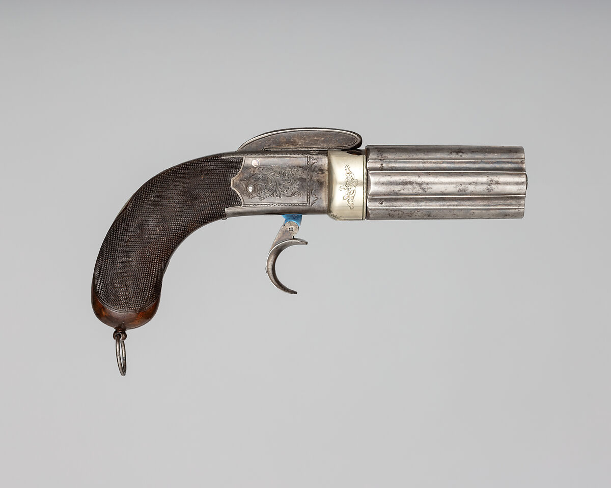 This type of pistol is commonly called a pepperbox, its defining feature being a rotatable cluster of full-length barrels. They were produced in large numbers in England in the 1830s-50s and were the first English revolvers to utilize percussion ignition system, though early examples of the English pepperbox date to the early 1800s and employed flintlocks. They commonly feature six or seven barrels machine bored from a single piece of steel, and a box-lock with a bar hammer at the top of the frame. This example is self-cocking, each pull of the trigger raising the releasing the hammer and rotating the barrel cluster. It utilizes a disk primer mechanism, instead of the more common percussion caps that fitted over a protruding nipple. It features a folding trigger, silver primer shield, and a blued frame and barrels, now faded, the frame and shield engraved with scrollwork.