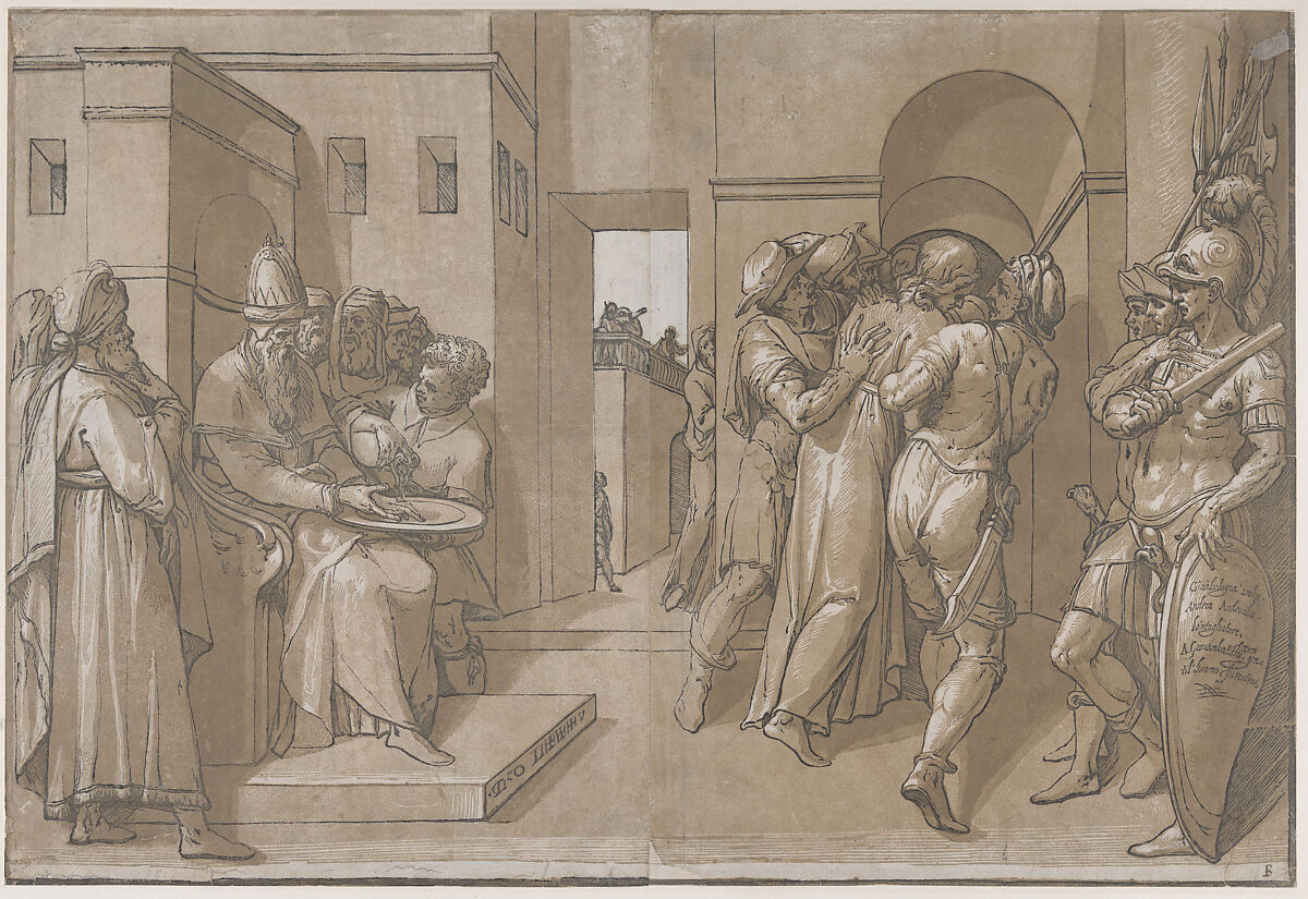 - Title: Christ is being led away, soldiers stand at the right (right side of sheet)