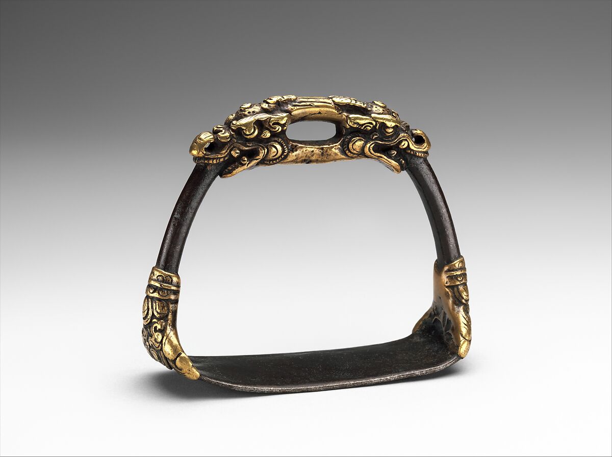 This stirrup is exceptional for the quality and lively nature of the dragonheads at the top of its arch, for its overall form and balance, and for the use of brass cladding over iron as a decorative technique, which is otherwise unknown on Tibetan or Mongolian stirrups. Its worn, hand-rubbed finish also shows that this stirrup was well appreciated over many generations for its tactile beauty.
