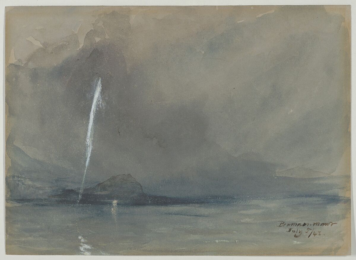 This moody nocturne centers on Beaumaris, a coastal town on the Welsh island of Anglesey. A scraped point of light on the shore, reflected in the sea, brings into resolution the washy layers applied to evoke water, land, and sky. A flare shooting into the darkness, created with white gouache, adds a further note of punctuation. Collingwood was twenty-four in 1843 when he painted this sheet, using techniques learned from the landscape painters James Duffield Harding and Samuel Prout. His choice of subject pays tribute to J. M. W. Turner’s famous series of watercolors devoted to British harbors and coasts.