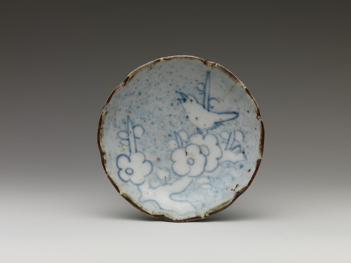 This set of small dishes represents the early phase of blue-and-white porcelain production in Arita. The painterly design of blossoming plum branches and a warbler may allude to the chapter “The Warbler’s First Song” in The Tale of Genji, which is associated with New Year’s celebrations—a notable depiction of a distinctly Japanese subject in Early Imari ware.