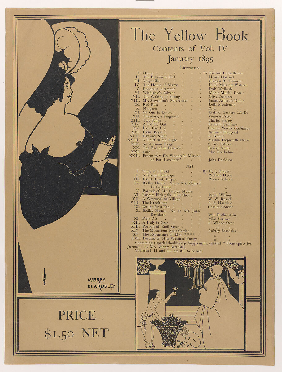 Printed on yellow paper (this has been trimmed at top and bottom; the missing text would have read "For Sale Here" above, and "Copeland and Day, Boston" below). The sheet is decorated with two images by Aubrey Beardsley and a list of the contents of the Yellow Book, Vol. IV. The image at left represents a seated woman reading in a wing chair. That at lower right shows a shirtless boy dressed in oriental pants offering a flower from an overflowing basket to a lady on a terrace. Text in a panel at upper right: "The Yellow Book, Contents of Vol. IV, January 1895, Literature: I-XXII (list of titles and authors); Art: I-XVI (list of titles and artists, include three by Aubrey Beardsley: XIV: The Mysterious Rose Garden, XV: The Repentence of Mrs.****; XVI: Portrait of Miss Winifred Emery). The image of the woman being offered a flower was used on the cover of The Yellow Book, Vol. IV.