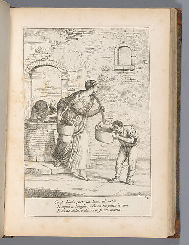 This print bound in a book containing a series of etchings depicting daily life in 18th century Venice, as well as popular trades of Venetians. The series was first published in Venice in 1753. The book contains an etched title, index, frontispiece, 60 etched plates, and a poem in English on folded paper that was repaired and inserted at the end of the book. Zompini added twenty plates to this second edition, published in 1785.