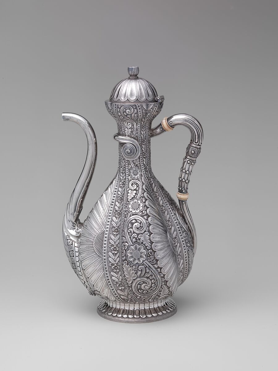 Made as singular or limited production “specials,” this sinuous coffee pot and tray epitomize the eclectic tastes and sensibilities that characterize the Aesthetic movement. Here Near Eastern forms and decoration are combined with conventionalized plant motifs inspired by the British design reform movement. The exquisitely crafted result is an inventive amalgam that is at once complex and coherent, showcasing Gorham designers and craftsmen at their best.