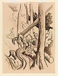 In 1929, at the Delphic Gallery in New York, Benton exhibited a series of sketches called The Lumber Camp, made in the forests of Tennessee, West Virginia, Kentucky, and Missouri. This sketch is one of dozens of drawings that Benton used to compose his mural America Today, also in the Museum’s collection (2012.478a–j). He used this imagery as the basis for the logging scene in the mural panel Midwest. For Benton, the mountains of this region "hold our simple pioneer past in their bosoms and . . . , in many instances, give us the peace of old, quaint, and quiet traditions."