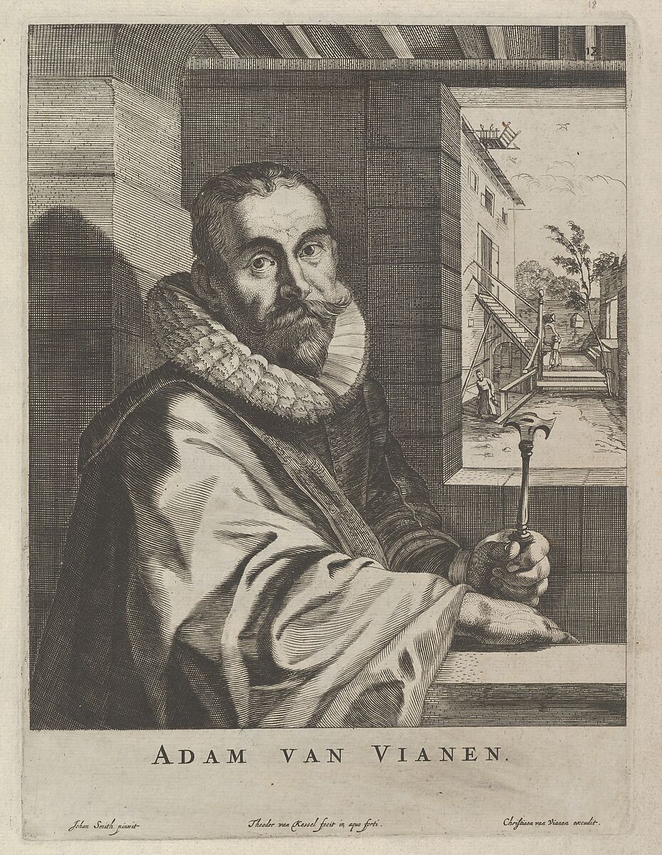 Portrait of Adam van Vianen, inserted as plate 18 in the second part of a series of 48 plates with designs in the Auricular style, predominantly after Adam van Vianen although some might be designs by his son Christaen. The designs were etched by Theodoor van Kessel and published in Amsterdam by Christaen van Vianen around 1646-1652.