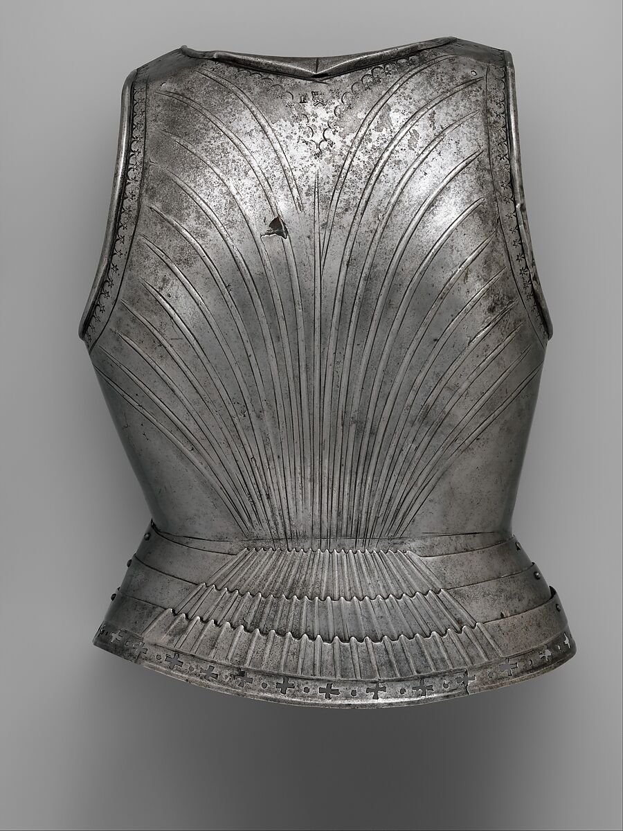 Judging by the maker's marks stamped on it, this backplate appears to be the only surviving identifiable work by Francesco Negroli, a member of a leading family of Milanese armorers, which, in the next generation, became internationally renowned for their sculpturally embossed armors all'antica (in the antique style). The backplate is in a style known as alla tedesca (in the Germanic fashion), suggesting that it was made for a client north of the Alps.