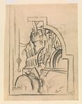 This sketch is one of dozens of drawings that Benton used to compose his mural America Today, also in the Museum’s collection (2012.478a–j). It loosely anticipates the combustion engine shown in cross section in the Instruments of Power mural panel in order to reveal the pistons firing inside. The men at the lower left and upper right working with the machine suggest connections to the panel Steel. Atypical of Benton’s studies, the contours he sketched here to account for the mural’s moldings do not conform to the final design.