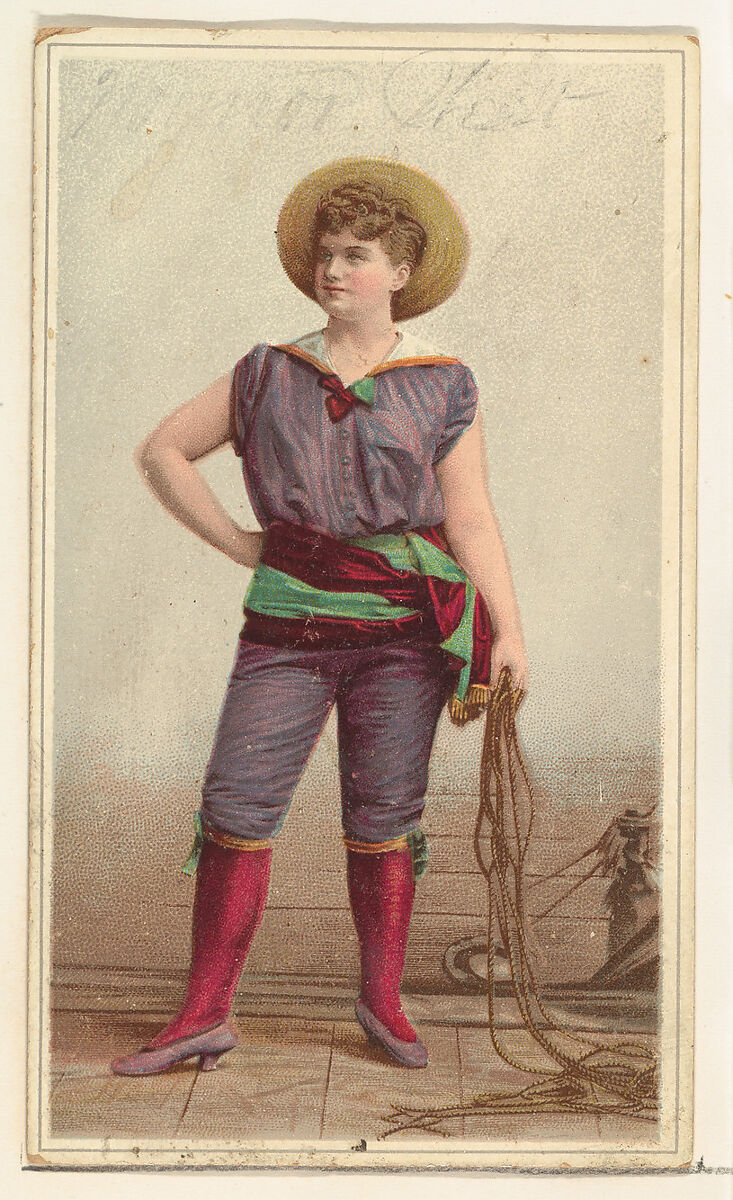 - Title: Actress wearing costume with wide sash and holding long rope, from Stars of the Stage, Second Series (N130) issued by Duke Sons & Co. to promote Honest Long Cut Tobacco