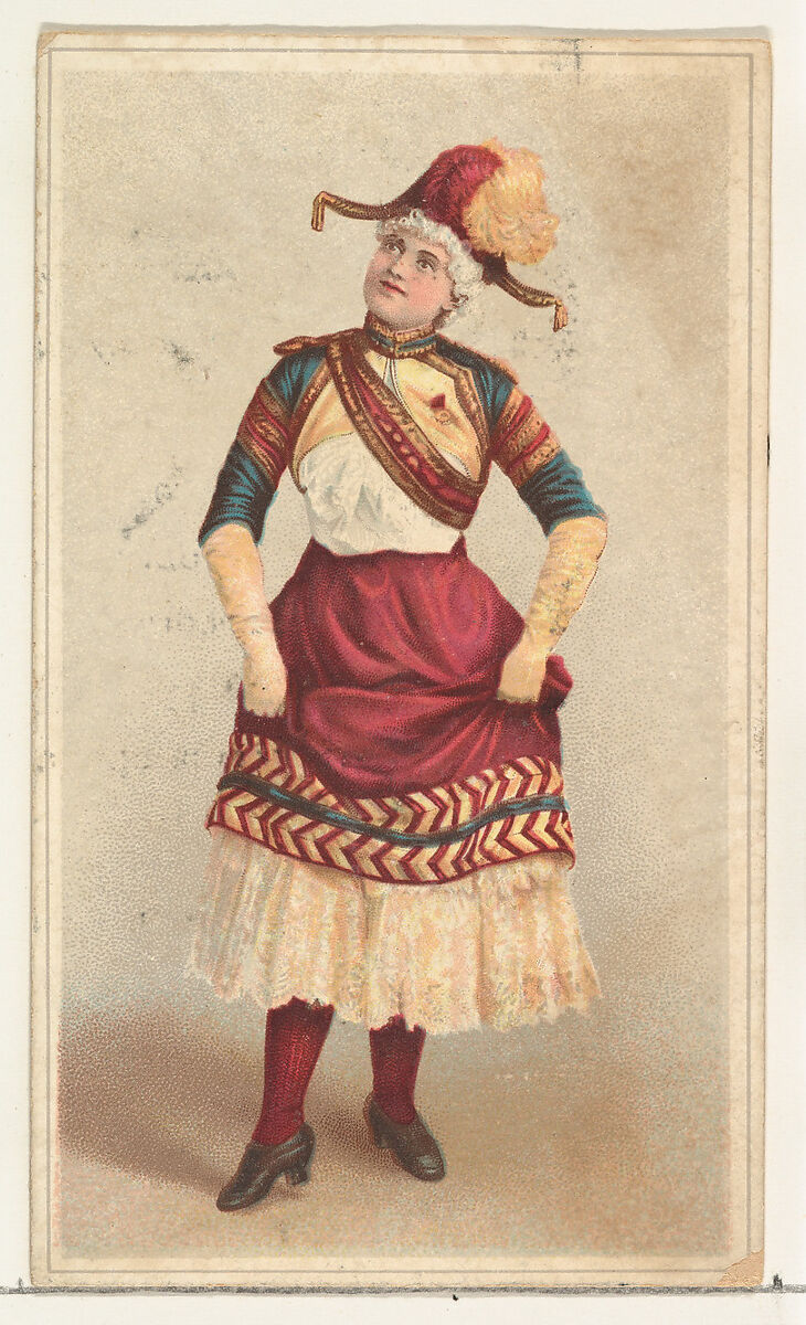 Actress lifting long skirt to dance, from Stars of the Stage, Second Series (N130) issued by Duke Sons & Co. to promote Honest Long Cut Tobacco
