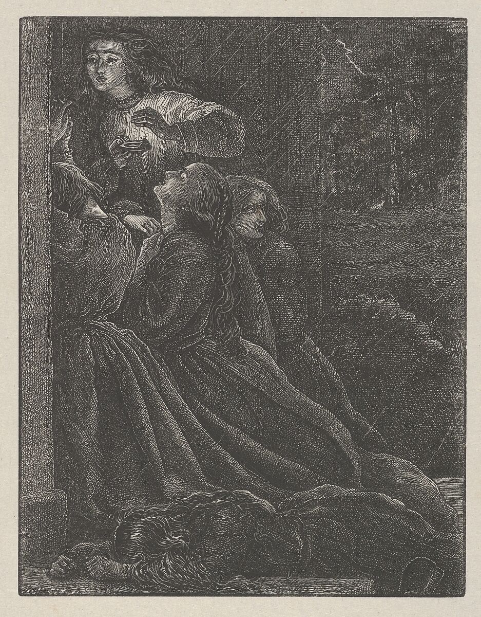 The Parable of the Ten (Wise and Foolish) Virgins appears in Matthew 25: 1-13, and inspired two designs, this second representing the fate of the foolish girls who failed to prepare for a nighttime journey, left too late, and are now shut out of a wedding feast. Pre-Raphaelite ideals shaped the combination of detailed naturalism and down-to-earth imagery to produce works distinctly different than most religious art of the period.