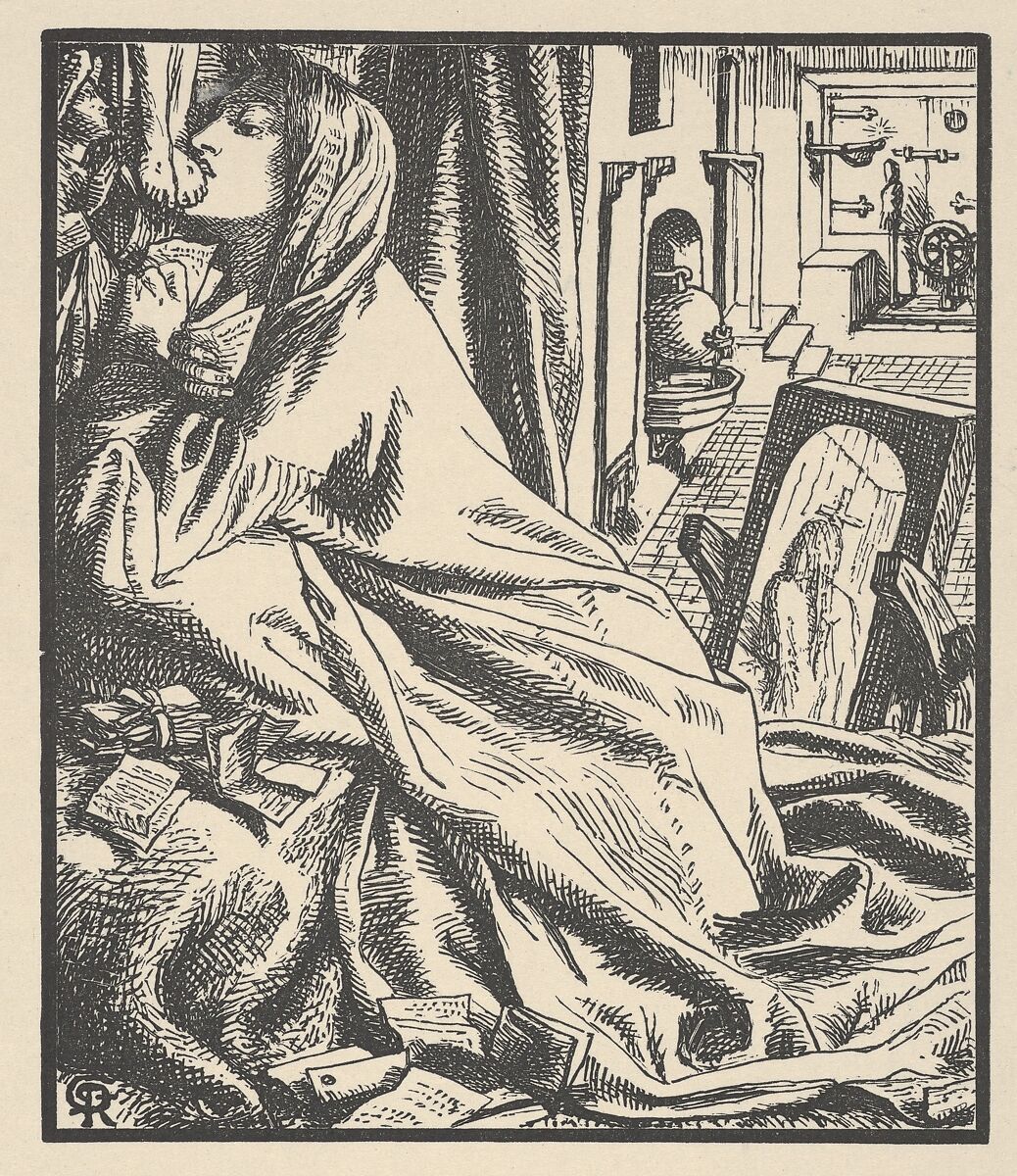 Rossetti’s 1857 illustrations of Tennyson—reissued here in 1903—incorporate startling effects derived from medieval and early Renaissance art. Space collapses, forms are cut off, and narrative details are inserted without concern for conventional perspective. Mariana kneels before a sharply receding room and kisses a crucifix. Rossetti criticized the engravers and insisted on many changes, delaying the publication.