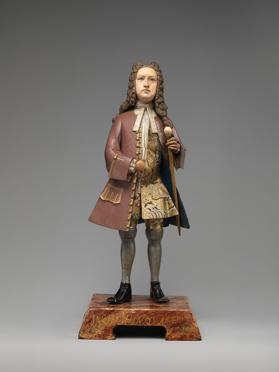 The figure is notable for the very high quality of the modeling of the face and wig, for the richly detailed costume, and especially for the impression it conveys of a specific individual. This is not a generic portrait of a European but rather a detailed likeness of a foreign merchant working in China, observed first hand. His affluence and status are conveyed by the fashionable clothes he wears, most specifically by the waistcoat painted to look like silk interwoven with gold metallic threads.