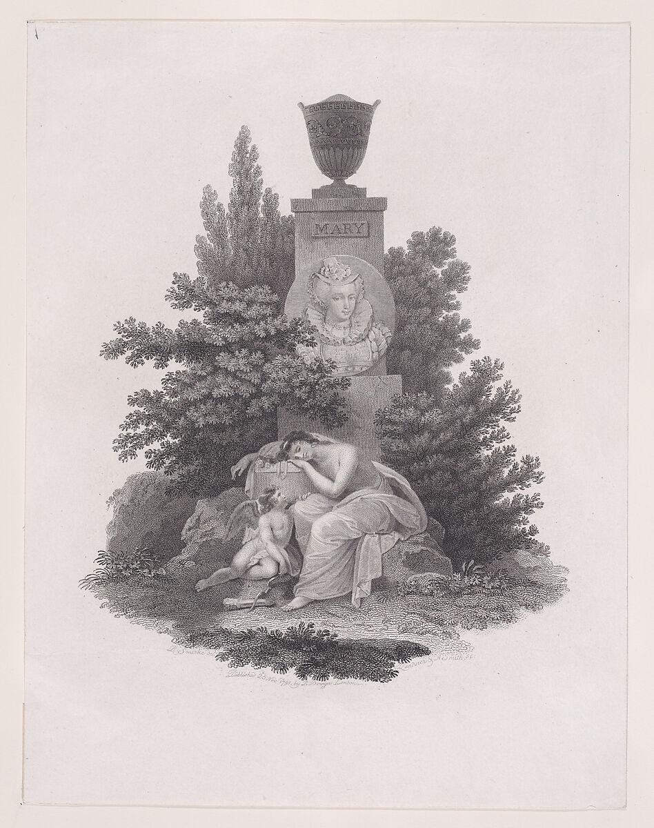 Vignette with a female allegorical figure and Cupid mourning beneath a stone roundel portrait of Mary set beneath an urn. From Robert Bowyer's edition of "The History of England" by David Hume.