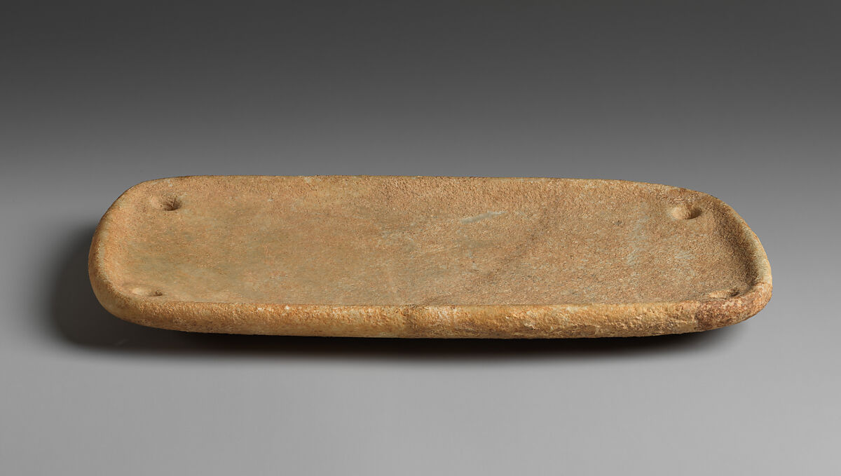 The palette is an established shape in the repertoire of Cycladic marble vessels. Recurrent traces of pigment on similar examples suggest that they were used to prepare colors for application to statuettes and perhaps also to human beings. The holes would have been used for suspension or affixing it to an object, possibly a marble figure.