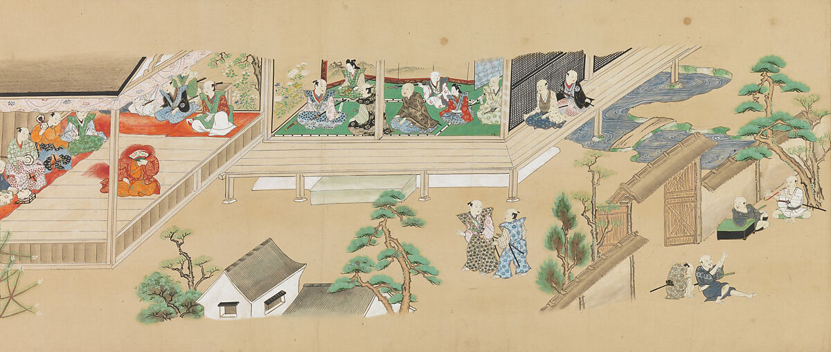 This unusual handscroll features scenes from six popular Noh plays depicted amid the daily lives of townspeople. Each painting was made on a separate sheet, which were all joined to form a long handscroll. It is likely that the scroll originally included inscriptions or excerpts between the paintings, from the six plays: Orangutan, Wind in the Pines, The Monk Shunkan, Rashōmon Gate, Chikubushima Island, and The Beach at Takasago.