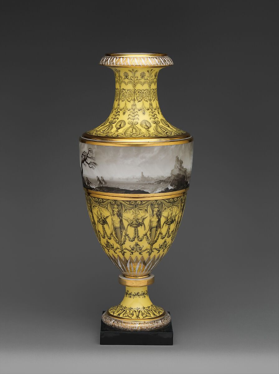 Both the technical quality and artistic innovation that characterize the best of Dihl et Guérhard’s production are evident in the Museum’s vases.[6] They are decorated with a ground of brilliant yellow, one of the colors that Dihl learned to fire successfully on hard paste, which often proved challenging in regard to ground colors. The yellow sections of each vase are decorated in black enamel with delicately rendered scrolls, peacocks, garlands of flowers, and, most prominently, with female terms, or half-length figures, alternating with birds resting in baskets of flowers.[7] This type of decoration is commonly known as “grotesque,” a reference to motifs painted in ancient Roman grottoes, which were rediscovered during the Renaissance. Grotesque decoration became popular again in late eighteenth- century France, where it was employed in either painted or carved form in fashionable interior architecture.