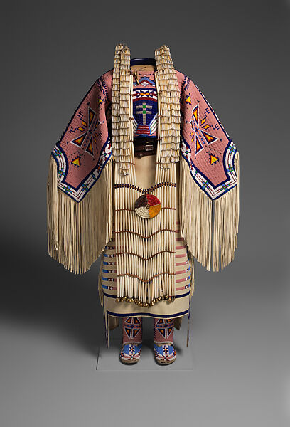 - Medium: Tanned and commercial leather, glass and metal beads, cotton, silk, dentalium shell, metal cones, horsehair, plastic, brass bells, porcupine quills, coins