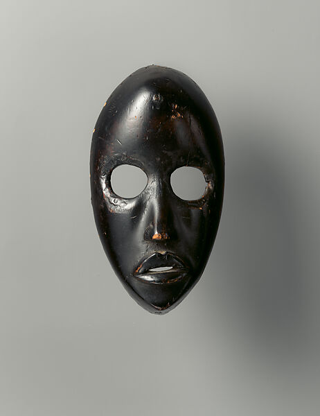 Carved from a single piece of soft wood, this oval face mask by a Dan carver of Côte d'Ivoire or Liberia features a wide forehead, large circular eye holes, and nose and mouth in high relief. The wood has been darkened and appears black with a shiny surface. Around the eyes are residue of an unknown material that might have once decorated the openings. The elliptical mouth exhibits a narrow slit separating the mask’s lips. The mask's rims are pierced with irregular holes for attaching the rest of the costume.
