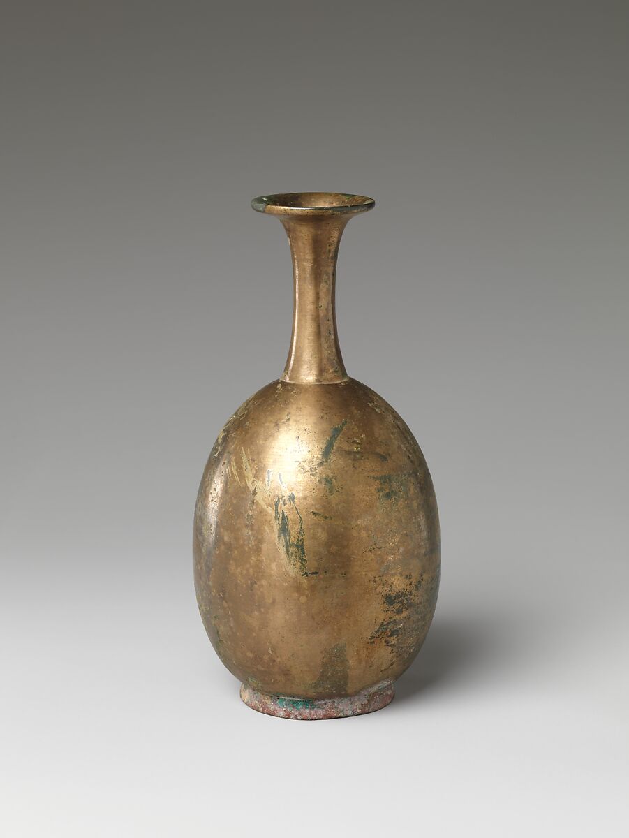 The shape of this vase most likely derives from Indian examples used to sprinkle water and other libations during ceremonies. Such vessels were introduced to China with Buddhism and can often be seen in the hands of bodhisattvas, particularly Avalokiteshvara (Guanyin). One of the Chinese names for vessels of this type is Guanyin ping, or “Avalokiteshvara vase.”