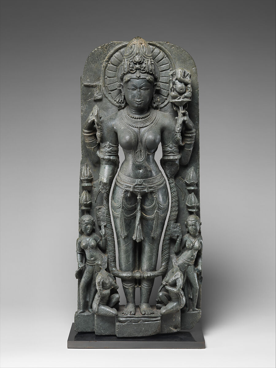 Gauri, along with her manifestations as Parvati and Uma, is represented four-armed, and with a distinctive conical Shiva-associated jatamukuta composed of hair braids, is embellished with jewels, including makara earrings and beautiful body jewelry. According to the puranic and sastric sources, the goddess can be represented holding a variety of attributes, the most frequently cited being the gesture of granting boons, a rosary, trident or mirror, and a vase or gesturing protection, and accompanied by her children, Ganesa and Karttikeya. Here only one hand survives, and holds a lotus-stem upon which is a seated Ganesa. The depiction of Ganesa affirms her Parvati-Uma lineage. From traces of the now lost attribute, her upper right hand appears to have held a hooked staff sometimes associated with this goddess. She stands in symmetrical posture (samabhanga) upon a plain pedestal where a lizard-like creature is depicted, usually identified as an iguana. In this form Gauri is characterized as godhikavahini, ‘[the deity] riding on an iguana’. She is flanked by a pair of female celebrants standing in tribanga posture, and at her feet two kneeling female worshippers, presumably donors.