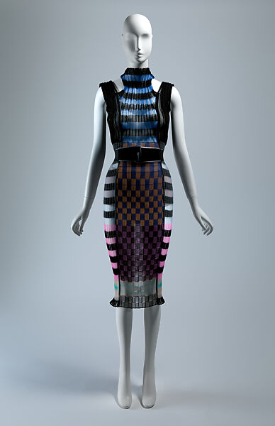 For the fall/winter 2013–14 haute couture show, Simons presented his contemporary take on the different crafts of the Parisian couture ateliers. He used the skillsets and specialized knowledge of the ‘petites mains’ of haute couture to present a silhouette which blended dyes, textiles and techniques from across the globe. This silhouette is an epitome of Parisian bourgeois chic (its three quarter sleeves, the belted waist and the skirt’s length attest to that) as well as a hi-tech vision of a ‘global village’. The visually arresting mix of op-art motifs is combined with pleating techniques, which gives the whole a tribal outlook.