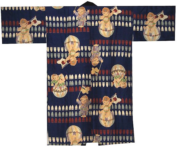 This boy’s kimono features a disturbing combination of cherubic soldiers alongside weapons of war and symbols of Japanese imperialism, imagery associated with strength and bravery that was appealing to the parents of young men during wartime. Some of the boys sit atop temari (lucky thread balls made as New Year’s gifts), while others carry swords. Their garments feature military insignia, warplanes, and nationalistic messages, including the word Shingun, or “Divine Army.” While some carry flags of Japan, others wave flags of the Japanese puppet state of Manchukuo (Manchuria, in northeast China). These visual references to warfare and the occupation of Manchuria, which Japan invaded in 1931 and controlled until 1945, incorporated notions of military aggression and expansionism into daily life.