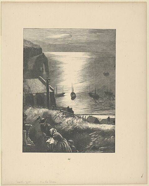 North's image first appeared in "Wayside Posies:Original Poems of the Country Life," a book edited by Robert Williams Buchanan, illustrated by G. J. Pinwell, J. W. North, and Frederick Walker, engraved by the Brothers Dalziel, and published by Routledge as a Fine Art gift book. In 1874, the publisher reissued the print in "Picture Poesies." The related poem, whose author is not identified, describes a man who waits to see if returning fishermen have found his beloved, whom he believes drowned. While the print shows a fisherman offering a basket of fish to his family, it does not directly address the tragic theme of the verse, but presents us with an idyllic fishing village and seascape.