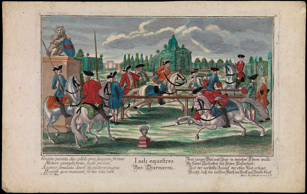 Although the course of the ring was immensely popular across sixteenth-century Europe, and gradually supplanted hazardous jousts and other forms of mock combats, over the late eighteenth century it quickly became outmoded, except in the German-speaking world. The Latin and German titles of this print aptly celebrate this remarkable continuity by equating the equestrian games (Ludi equestres) of the eighteenth century with the venerable tournament (Das Thurnieren).