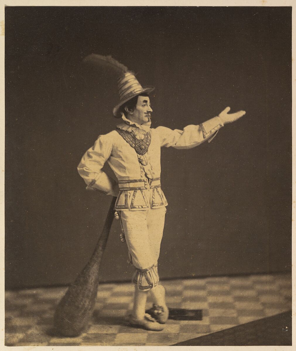 John Wilkes Booth. This light-hearted photograph depicts a costumed figure—possibly a character from the commedia dell’arte—striking a gallant pose in a dramatic composition that emphasizes the theatrical nature of studio portraiture.