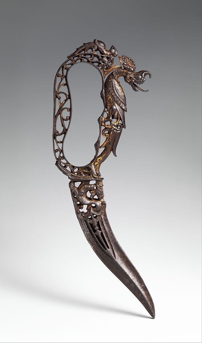 This intricately crafted dagger is among the best examples of ornamental steel chiseling from southeastern India, an area renowned for this kind of metalwork. It may belong to a group of ornately decorated weapons that was preserved in the palace armory of Tanjore (present-day Thanjavur, Tamil Nadu) until the 1850s. The dagger is particularly noteworthy for the fineness of its workmanship, including complete figures in the round, and for retaining areas of original gilding, which is entirely missing on most surviving pieces of this type.