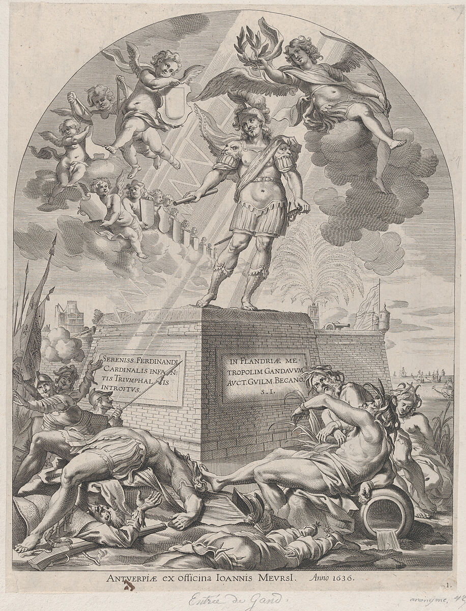 On January 28, 1635, the city of Ghent celebrated the entry of Cardinal-Infante Ferdinand of Spain, the recently appointed governor of the Southern Netherlands. A group of Flemish artists were commissioned to create paintings for the decoration of two triumphal arches erected in the city's main square for the occasion. Though the majority of these canvases are now lost, the engravings in Guillielmus Becanus's 'Serenissimi Principis Ferdinandi, Hispaniarum Infantis, S.R.E. Cardinalis, Triumphalis Introitus in Flandriae Metropolim Gandavum', Antwerp [1636], illustrate what the series looked like. The Metropolitan Museum of Art owns 34 plates from the set of 42.
