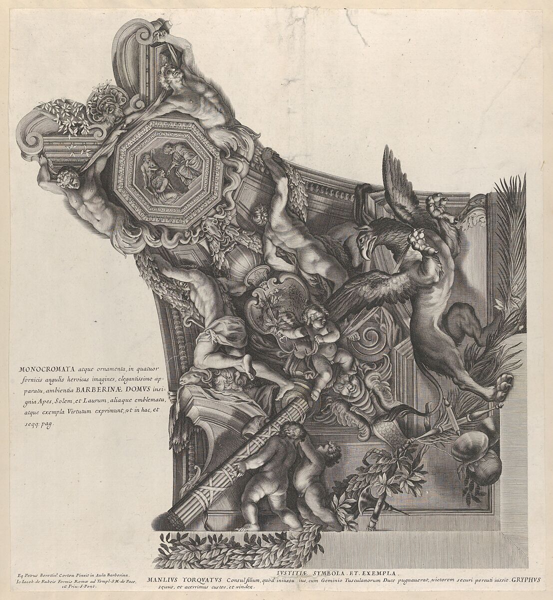 - Title: Plate 7: Allegory of Justice with griffin of Manlius Toquatus, from "Barberinae aulae fornix"