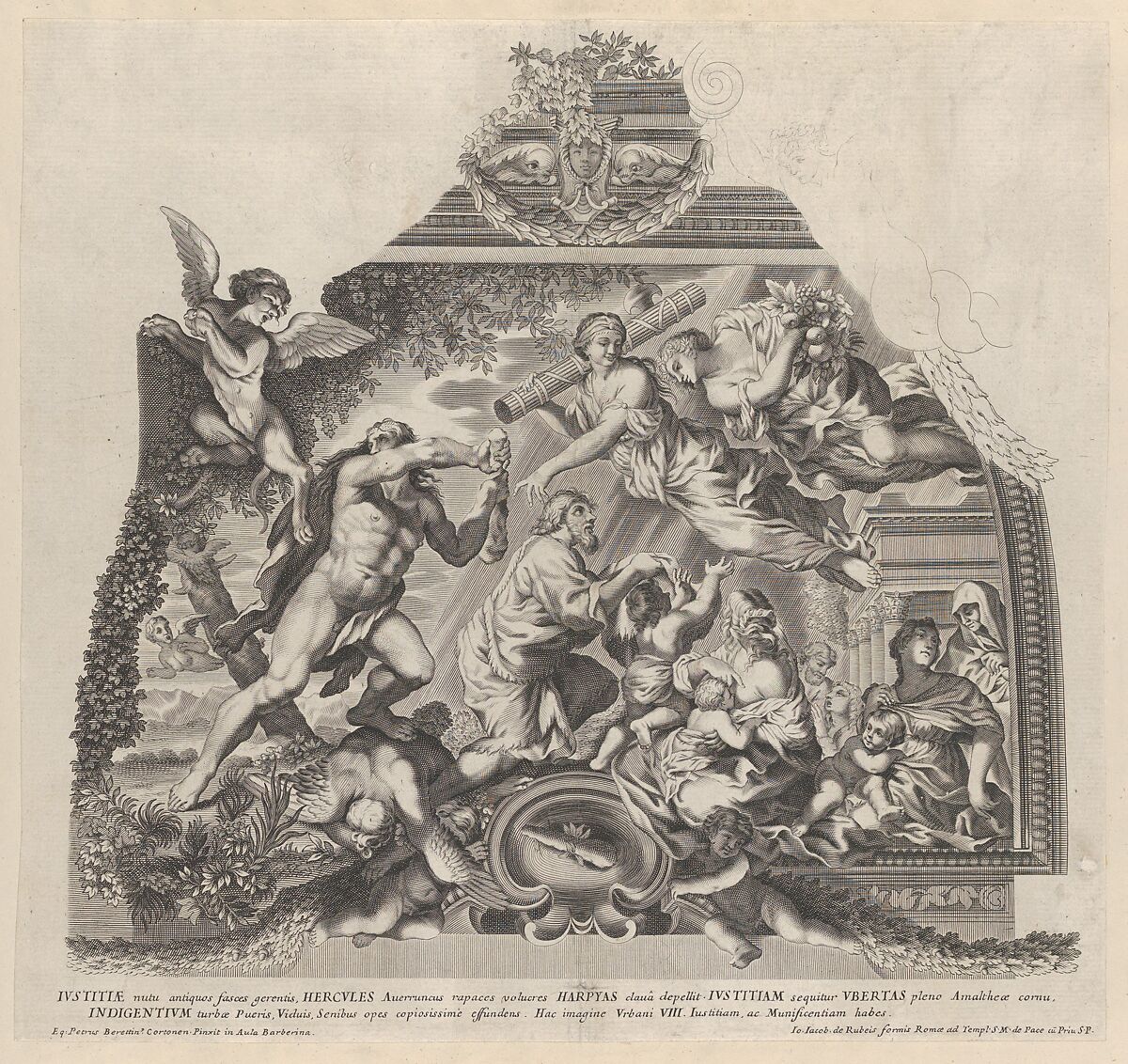 - Title: Plate 6: Allegory with Hercules chasing off the Harpies as Justice and Plenty aid the poor, from "Barberinae aulae fornix"