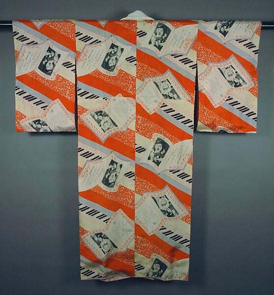 This under-kimono, an informal garment, is decorated with a set of diagonally arranged images of piano keyboards and libretti from two songbooks, including the “Lullaby of Edo” (“Edo komoriuta”), by opera singer Sekiya Toshiko (1904–1941), and the “Flowers of the Linden Tree” (“Bodaiju no hana”), by an unidentified woman named Takeko.