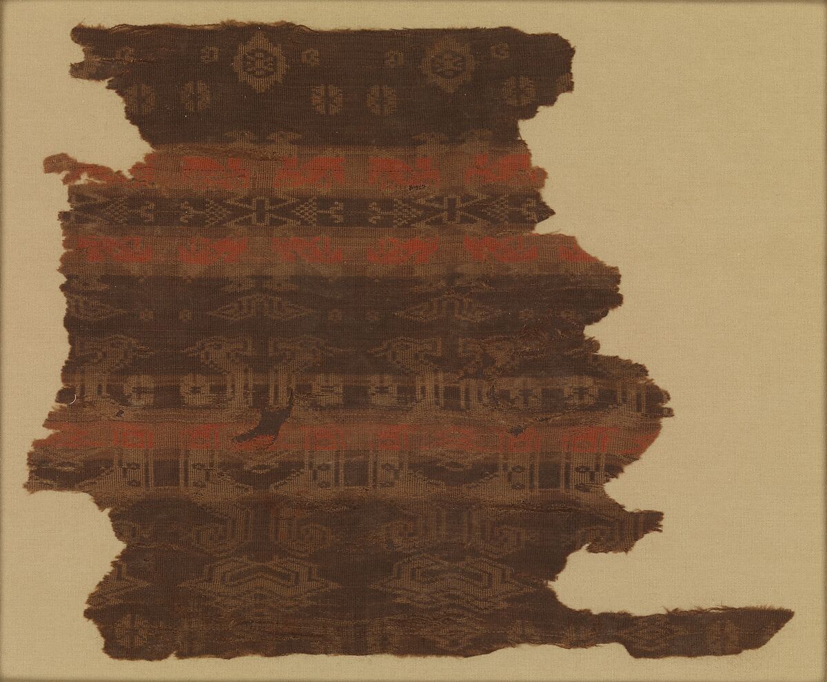 The oldest Chinese textiles in the Museum's collection (2002.558, .559), these two fragments with a pattern of geometric motifs and birds or dragonlike animals come from the same length of woven silk. The stripes, probably dyed with cinnabar, retain a fresh red color. Cinnabar was mined in China as early as three to four thousand years ago and has been found in Late Neolithic tombs. By the time of the Western Zhou dynasty (ca. 1046–771 B.C.), the Chinese were refining and processing it to obtain the very best red color. Little of the mineral dye was produced, however, and its use was restricted to luxury textiles for the elite.