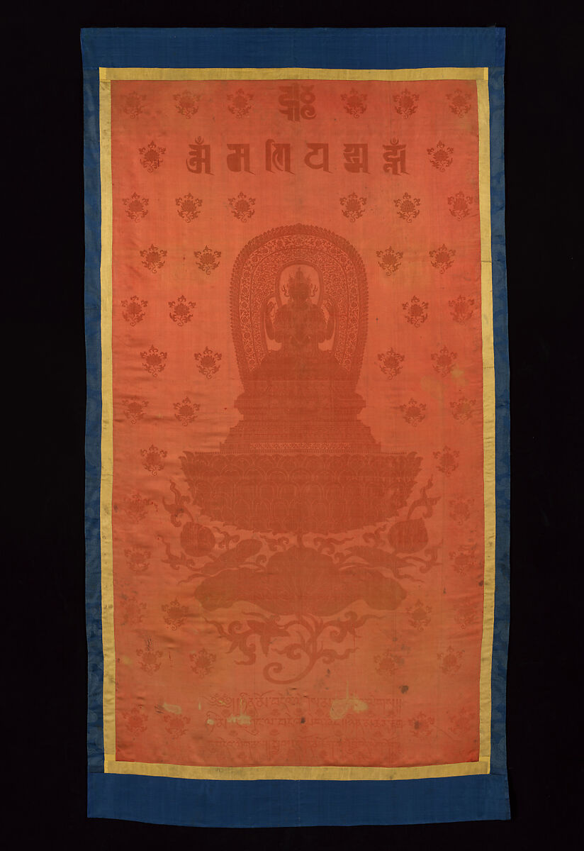 Woven in a single color, this temple hanging represents Shadakshari Lokeshvara, a four-armed variant of the bodhisattva of compassion (Avalokiteshvara). Parallel to the gilt bronze images made in the imperial workshop of the Ming dynasty, the bodhisattva sits on a tiered throne and is adorned with exquisite jewelry and an elaborate mandorla. The bodhisattva personifies the six-character Sanskrit invocation om mani padme hum (hail to the jewel in the lotus), which is woven at the top of the hanging beneath the seed syllable hrih.