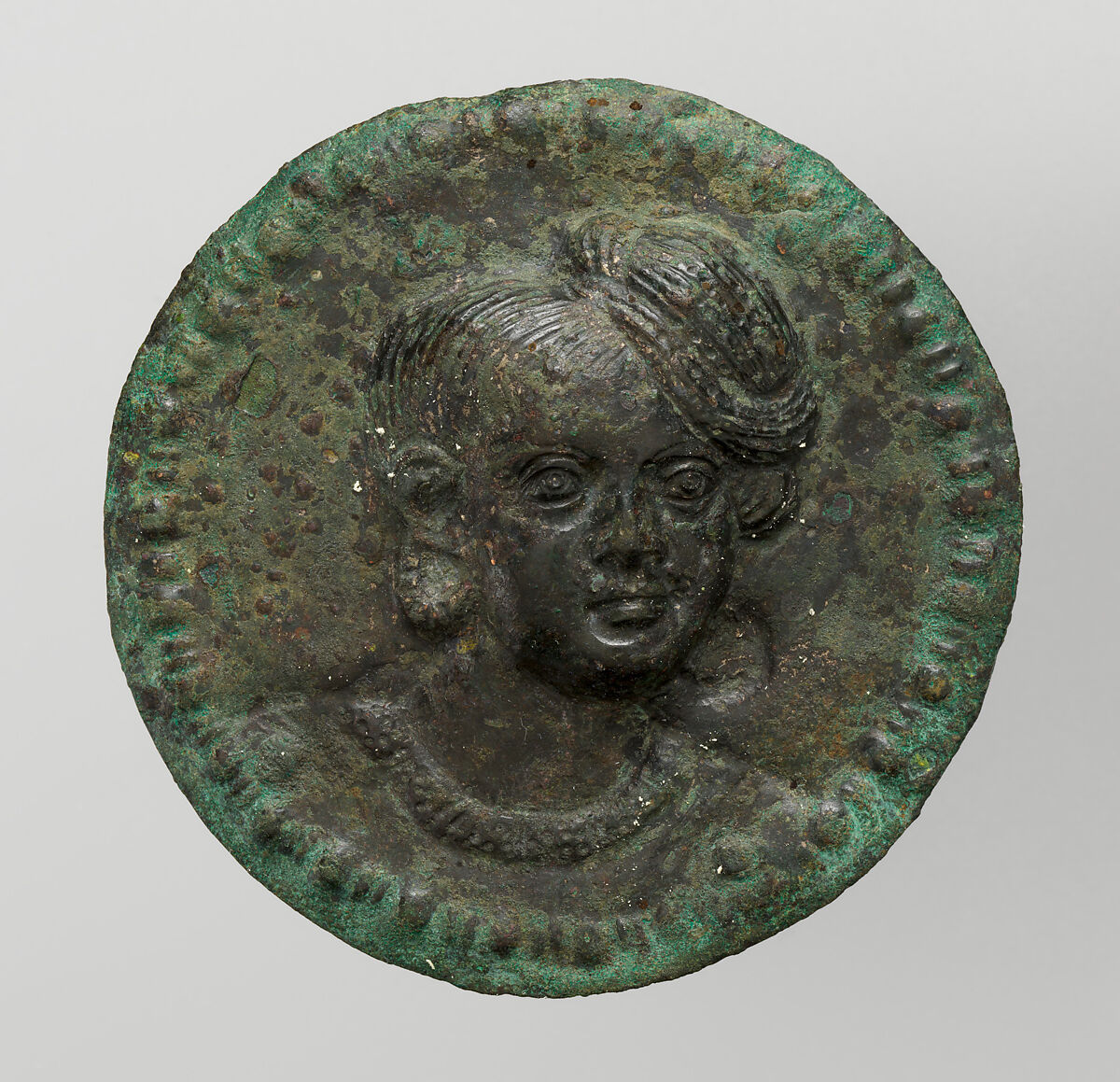 This elegant pair (with 2003.16.2) of roundel medallions with male busts, probably worn as cloak clasps, display a naturalism rarely encountered in portrait imagery found on Satavahana or Kushana coins and medallions. This object type has a lineage reaching back to Hellenistic Alexandria and more immediate parallels in Parthian (Iranian) royal portraiture of the first century CE. They were likely inspired by West Asian examples that circulated in the Indian luxury market.