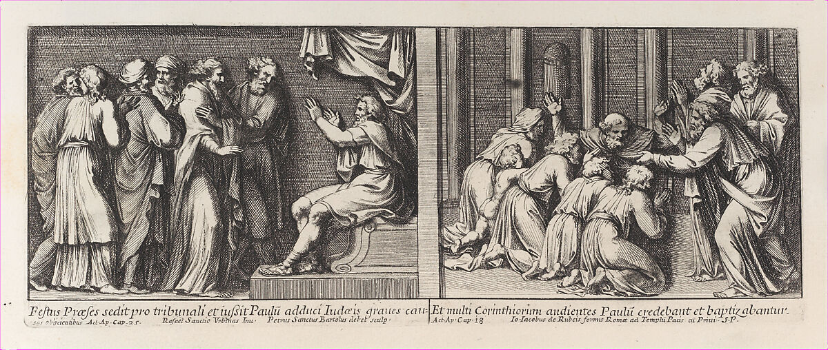 - Title: Two Biblical Scenes: Festus judging Saint Paul at left and Saint Paul Baptizing the Christians of Corinth at right, from a series of 15 plates depicting Raphael's works for the Vatican stanze and the Sistine Chapel tapestries
