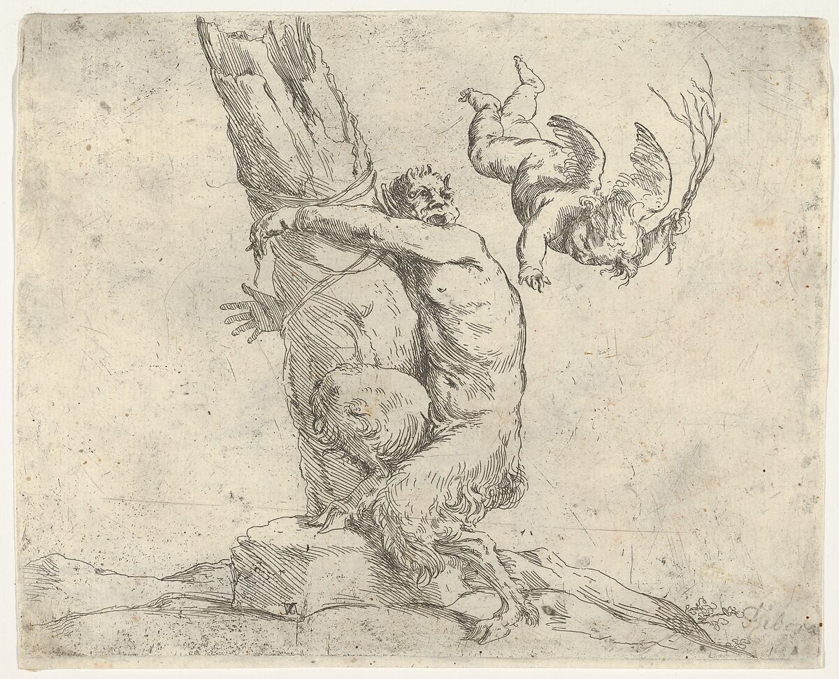 - Title: A winged putto flogging a satyr tied to a tree