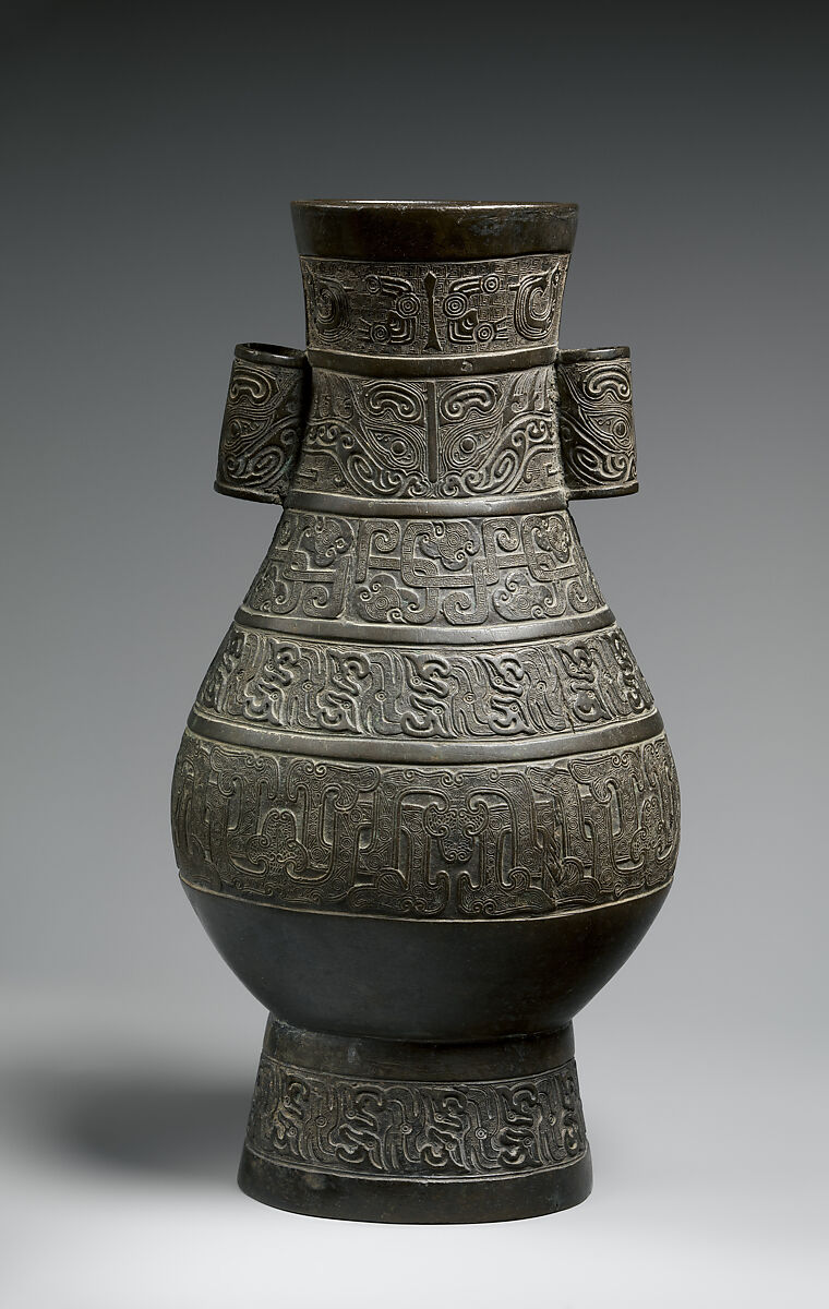 This finely cast vase resembles an ancient wine container illustrated in antiquarian catalogues. In keeping with its new function as a vase, however, its body has been elongated, and its cross section flattened. The ornamental bands were freely taken from various objects from different ancient periods. This work is a creative reinterpretation rather than a literal copy of the decorative patterns derived from archaic bronzes, indicative of the new aesthetic that accompanied the vessel’s new function.